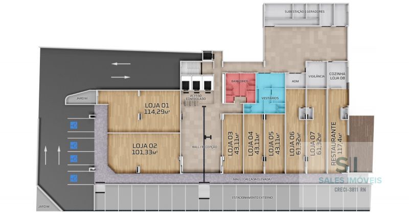 •Lojas com 117,40m², 114,29m², 101,33m², 61,32m² e 43,11m²;