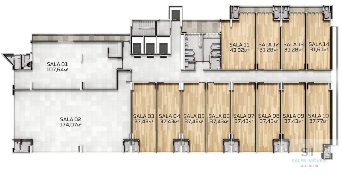 •Salas com 198,22m², 129,92m², 52,13m², 47,94m², 45,28m², 40,40m² e 39,14m²;